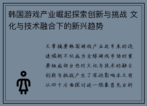 韩国游戏产业崛起探索创新与挑战 文化与技术融合下的新兴趋势